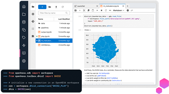 Data scientists can write Jupyter notebooks in OpenHEXA to explore their data and write advanced analysis programs with Python or R.