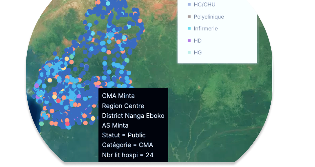 The map-based dashboards produced by OpenHEXA highlight the geographic distribution of health facilities across Cameroon. Decision-makers instantly see which areas are underserved, how facility categories vary by region, and where additional support is most needed.