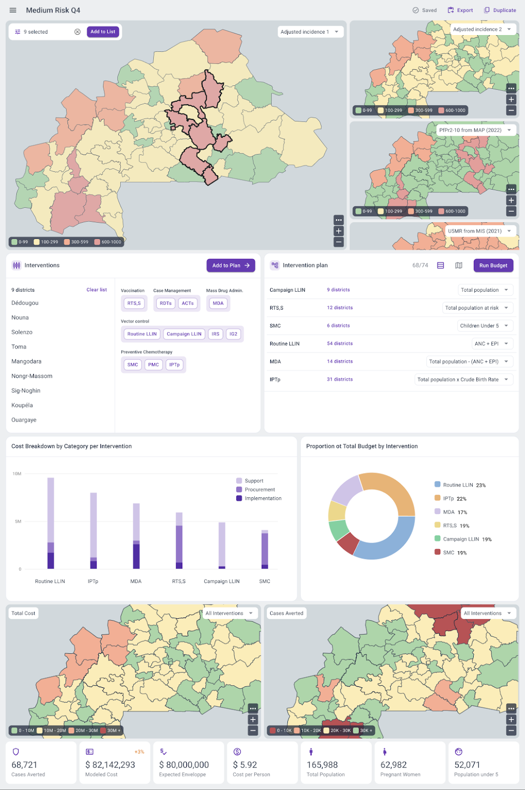 - Select spatial units such as districts based on malaria risk and population data.